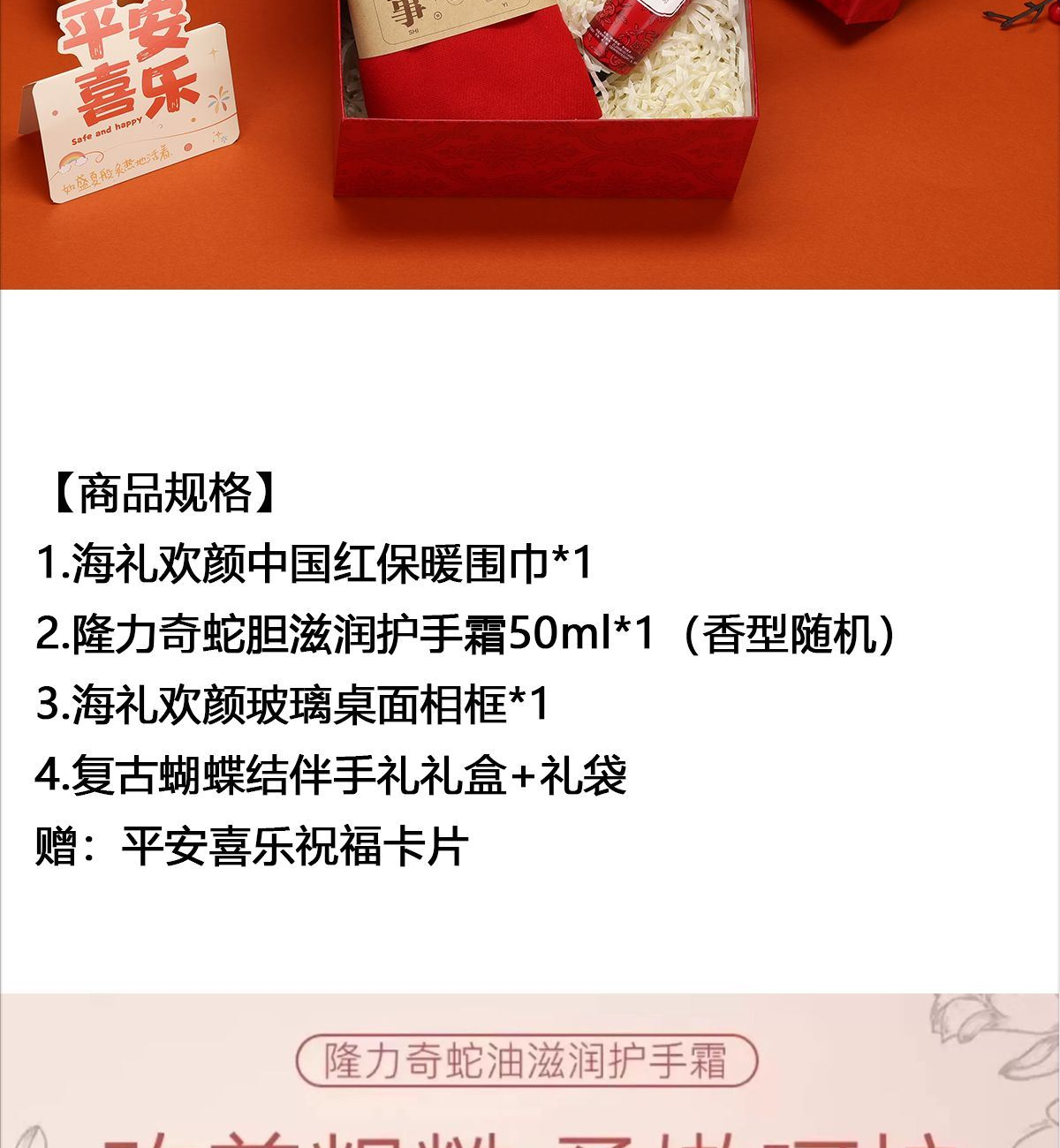 1.海禮歡顏中國紅保暖圍巾*1 2.隆力奇蛇膽滋潤護手霜50ml*1(香型隨機) 3.海禮歡顏玻璃桌面相框*1 4.復古蝴蝶結(jié)伴手禮禮盒+禮袋 贈:平安喜樂祝??ㄆ? 產(chǎn)品賣點:喜慶吉祥的中國紅圍巾?? 、??滋潤呵護的經(jīng)典護手霜?? 與??珍藏美好瞬間的相框??巧妙結(jié)合,并通過??精致的復古禮盒??與??祝??ㄆ?? 傳遞出滿滿的誠意與溫度,非常適合作為冬季贈送給親友、y企業(yè)員工、客戶或長輩的貼心好禮