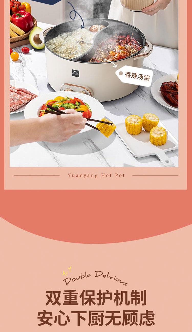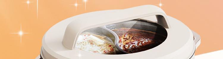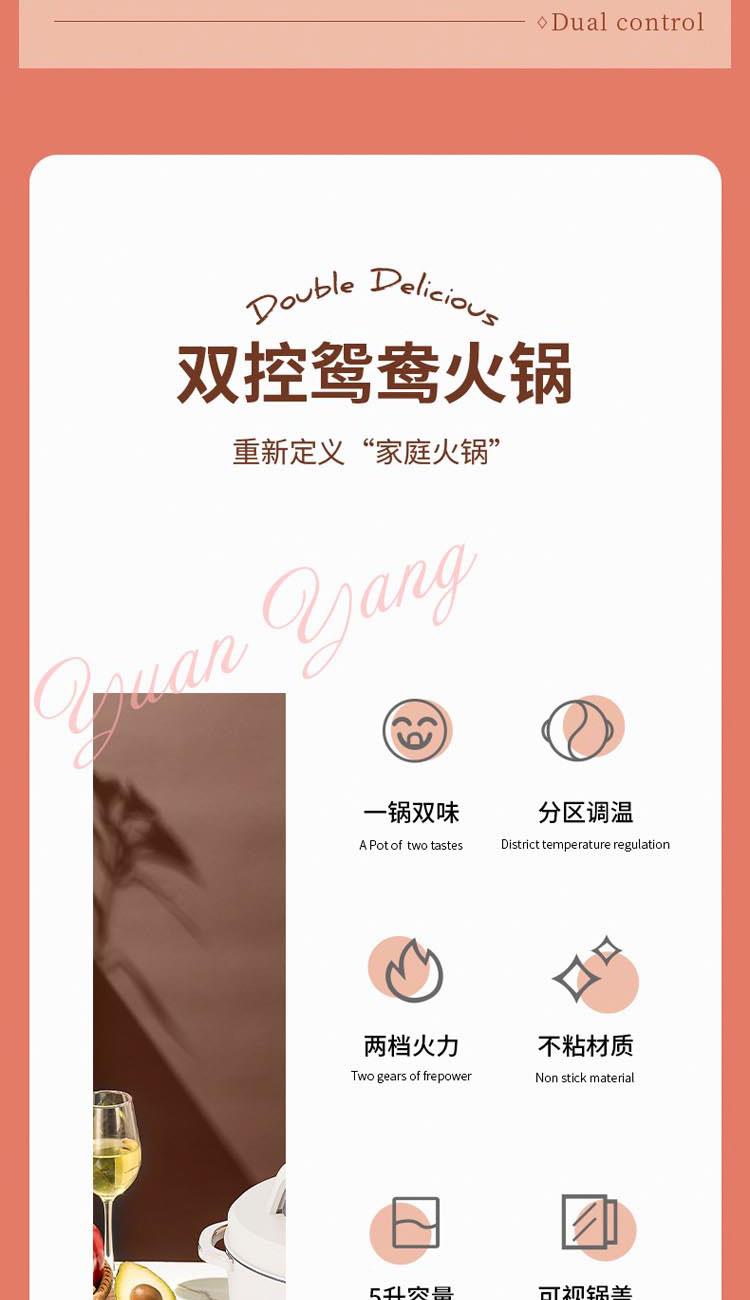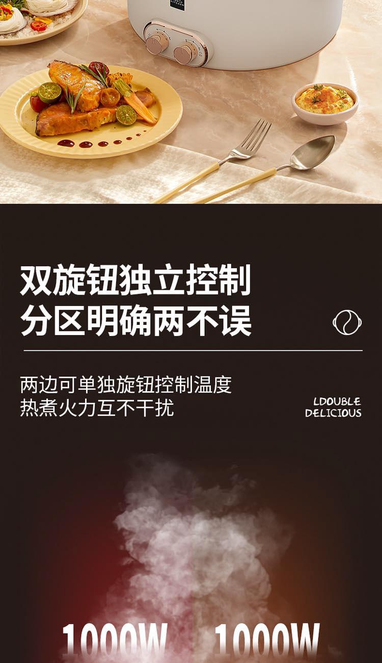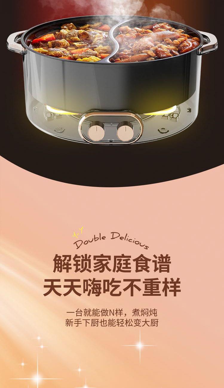 額定電源:220V~ 50Hz 額定功率:2000W 產(chǎn)品尺寸:360*310*218mm 彩盒尺寸:355*400*275mm 外箱尺寸:730*420*580mm 額定容量:5L 材 質(zhì):pp塑料/304不銹鋼/410不銹鋼 彩盒毛重:2.75kg 外箱毛重:11.5kg 一體式鴛鴦鍋,同時享受不同美味 / 5.0L大容量,滿足多人使用 雙溫控旋鈕,火力自由調(diào)節(jié) / 防粘涂層鍋體,清潔方便