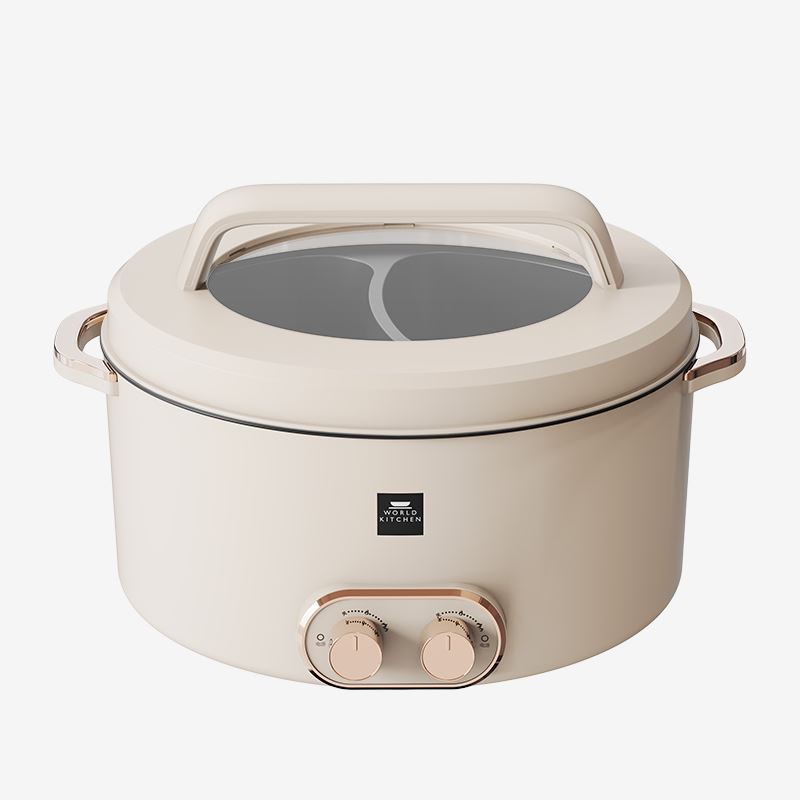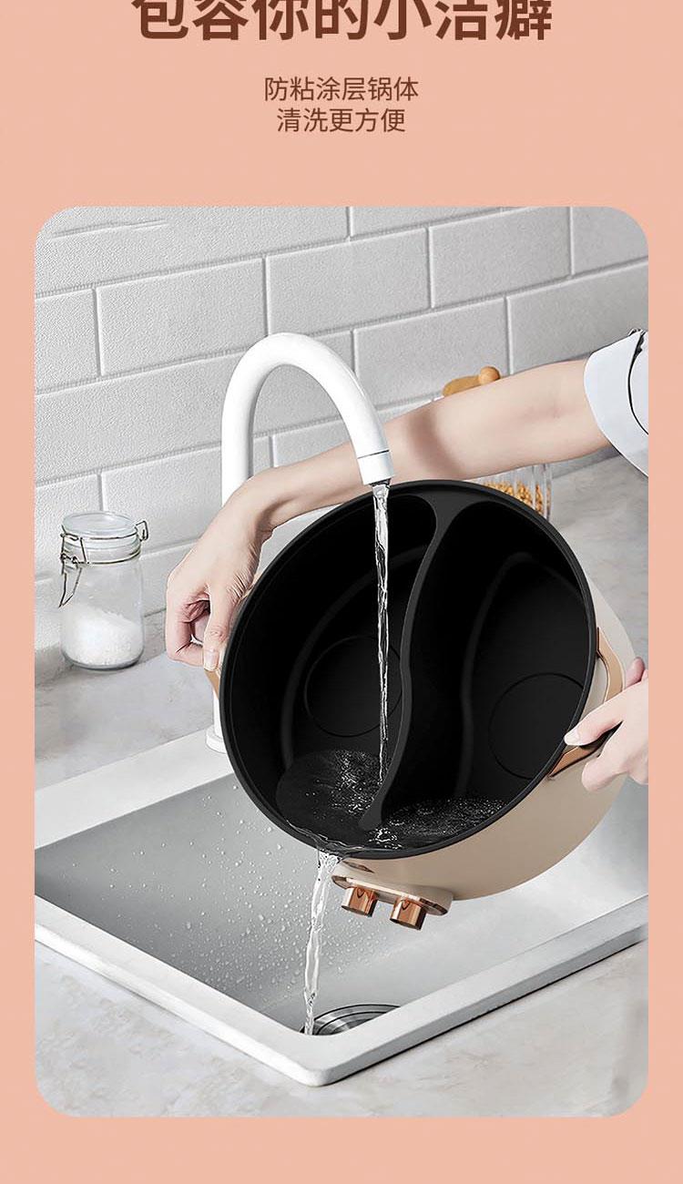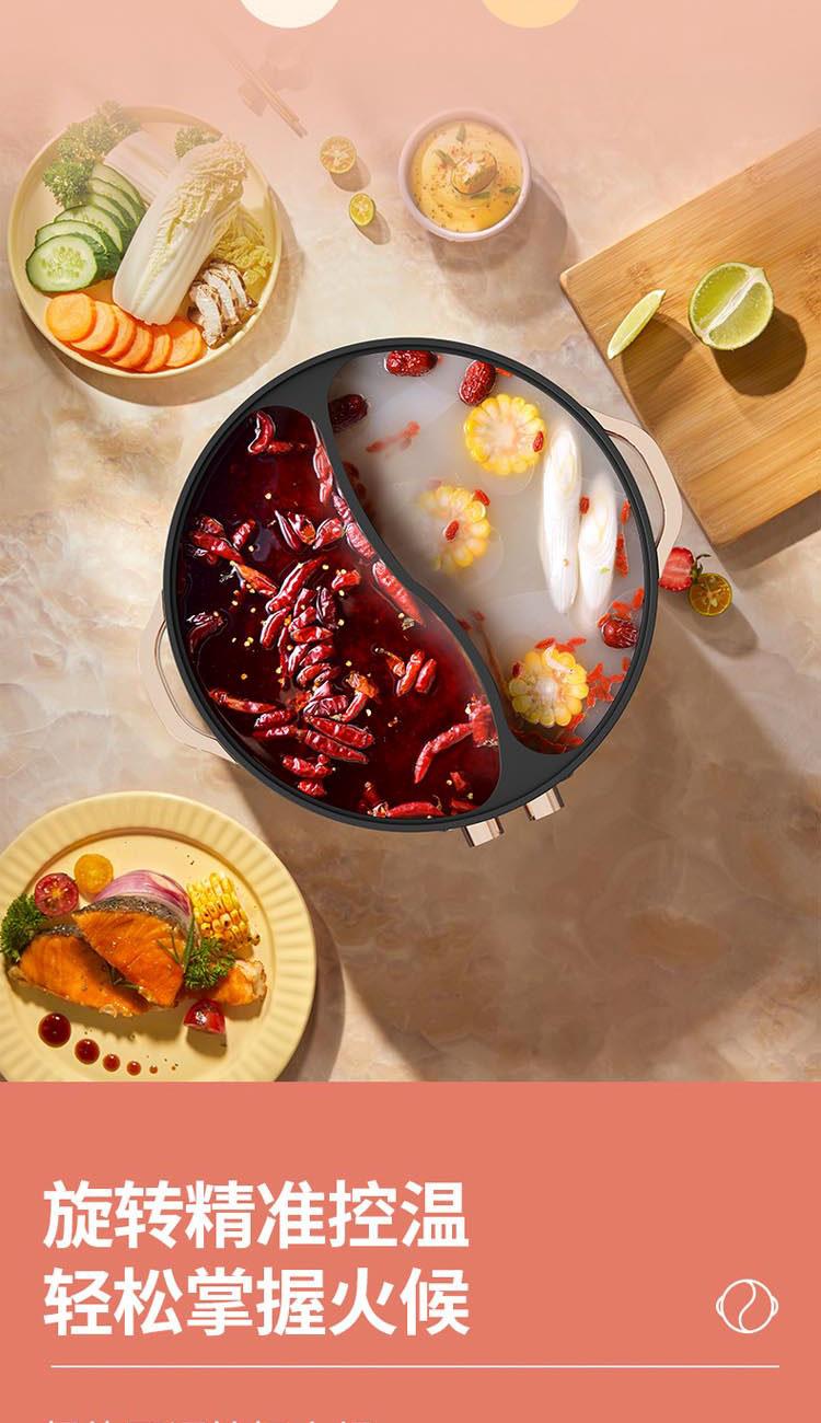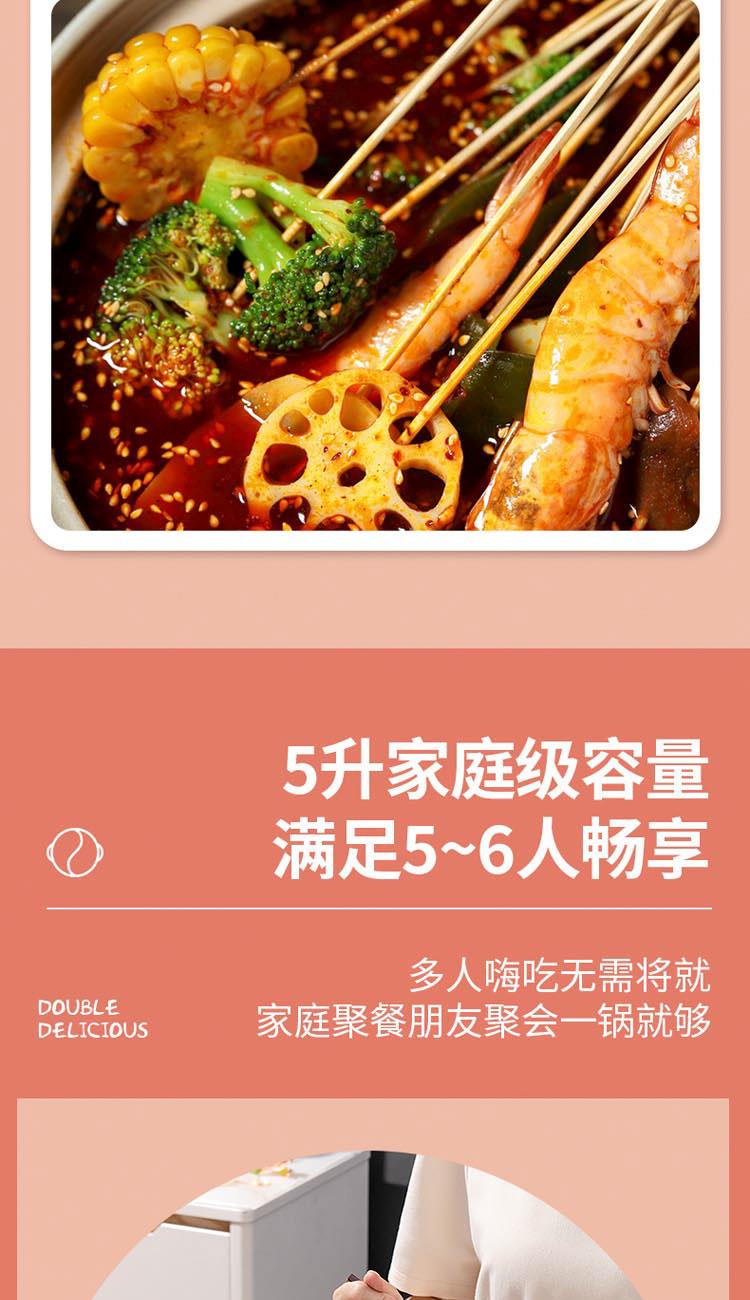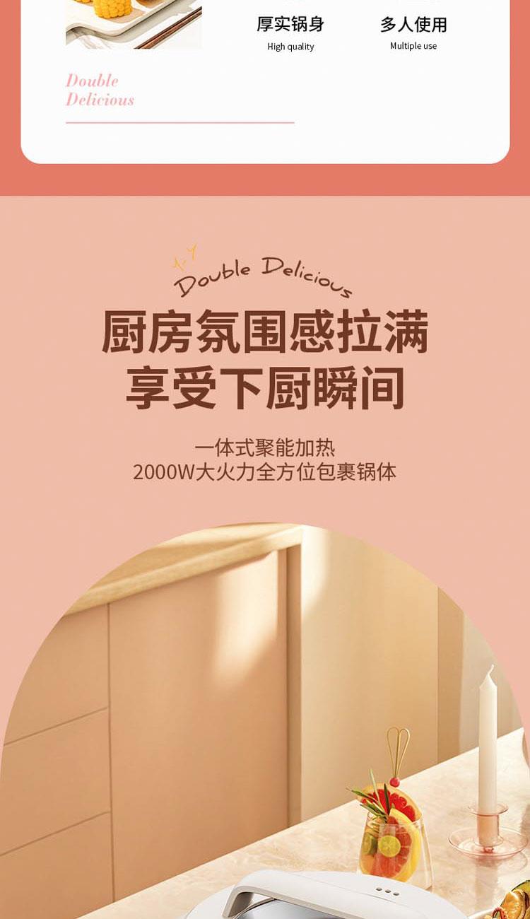 額定電源:220V~ 50Hz 額定功率:2000W 產(chǎn)品尺寸:360*310*218mm 彩盒尺寸:355*400*275mm 外箱尺寸:730*420*580mm 額定容量:5L 材 質(zhì):pp塑料/304不銹鋼/410不銹鋼 彩盒毛重:2.75kg 外箱毛重:11.5kg 一體式鴛鴦鍋,同時享受不同美味 / 5.0L大容量,滿足多人使用 雙溫控旋鈕,火力自由調(diào)節(jié) / 防粘涂層鍋體,清潔方便