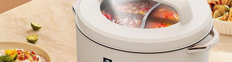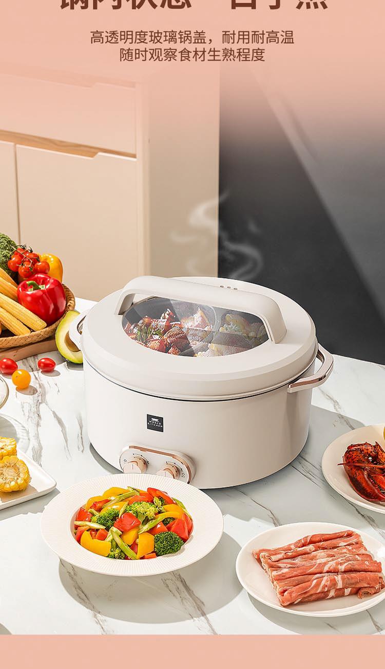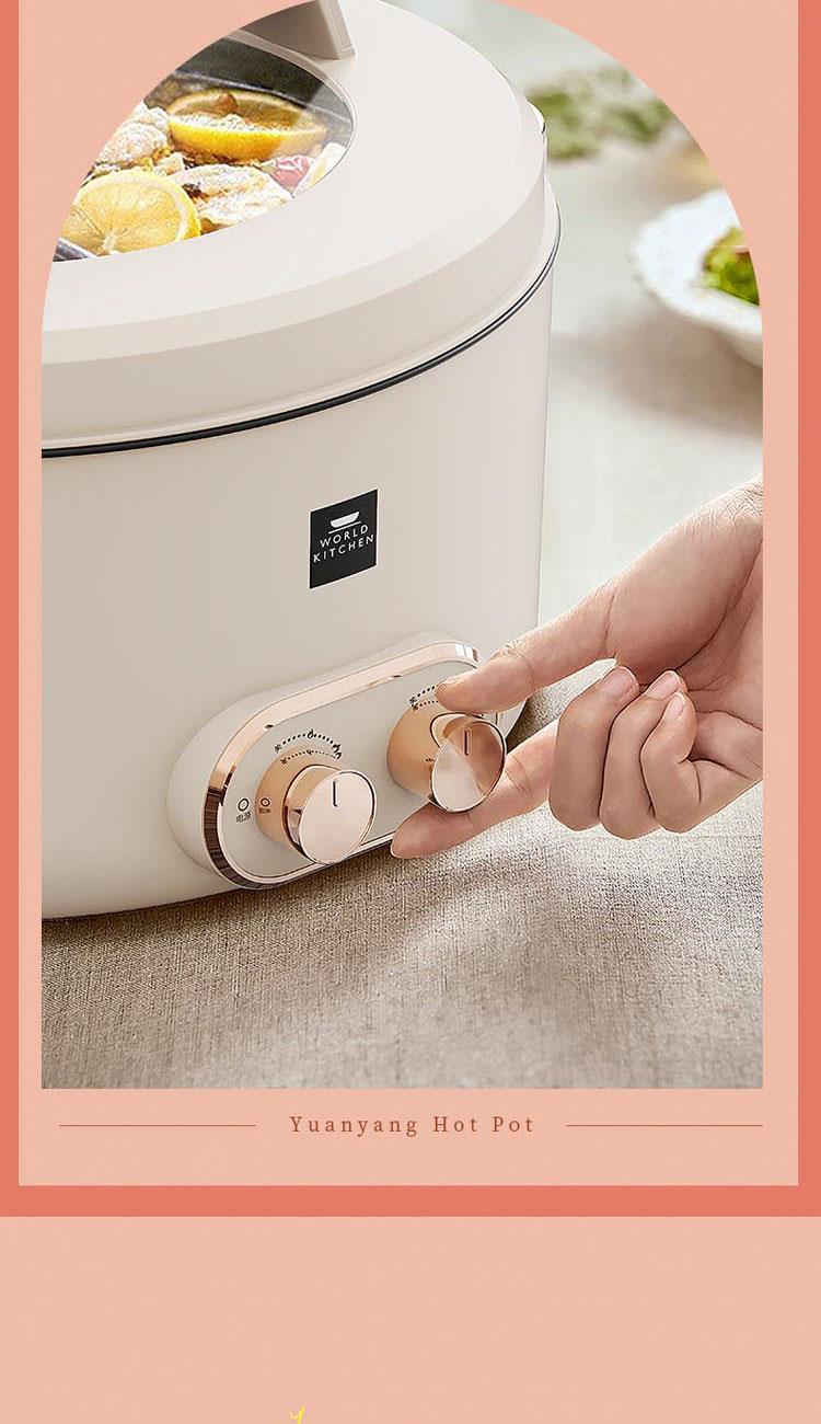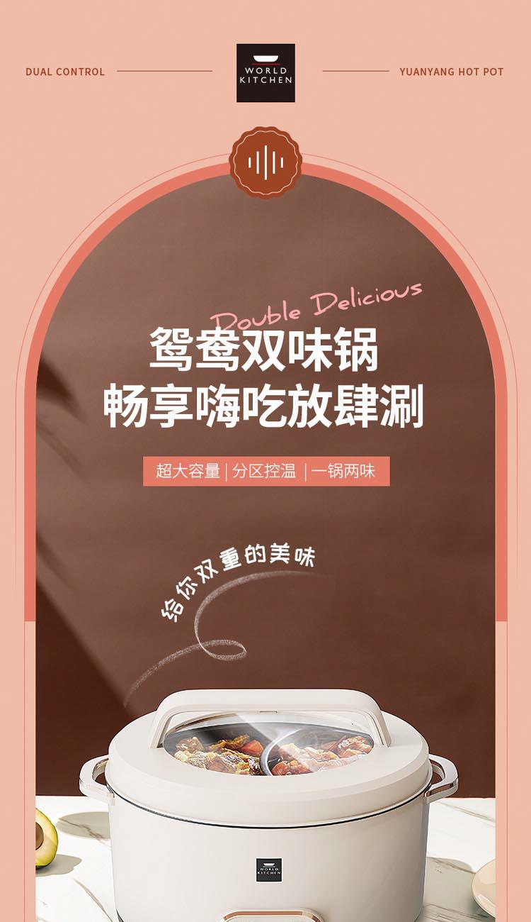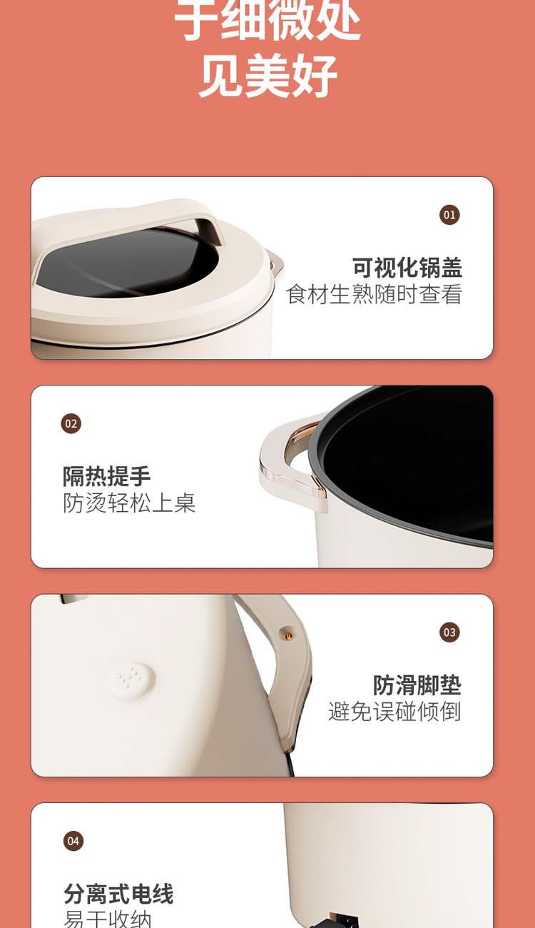 額定電源:220V~ 50Hz 額定功率:2000W 產(chǎn)品尺寸:360*310*218mm 彩盒尺寸:355*400*275mm 外箱尺寸:730*420*580mm 額定容量:5L 材 質(zhì):pp塑料/304不銹鋼/410不銹鋼 彩盒毛重:2.75kg 外箱毛重:11.5kg 一體式鴛鴦鍋,同時享受不同美味 / 5.0L大容量,滿足多人使用 雙溫控旋鈕,火力自由調(diào)節(jié) / 防粘涂層鍋體,清潔方便