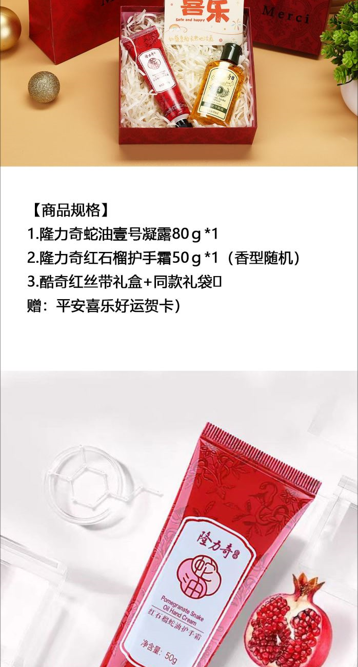 【適用范圍】 -年會禮品、企業(yè)員工福利、銀行保險、積分兌換、隨手禮、節(jié)日慶典 【商品規(guī)格】 1.隆力奇蛇油壹號凝露80g*1 2.隆力奇紅石榴護手霜50g*1(香型隨機) 3.酷奇紅絲帶禮盒+同款禮袋 (贈:平安喜樂好運賀卡)